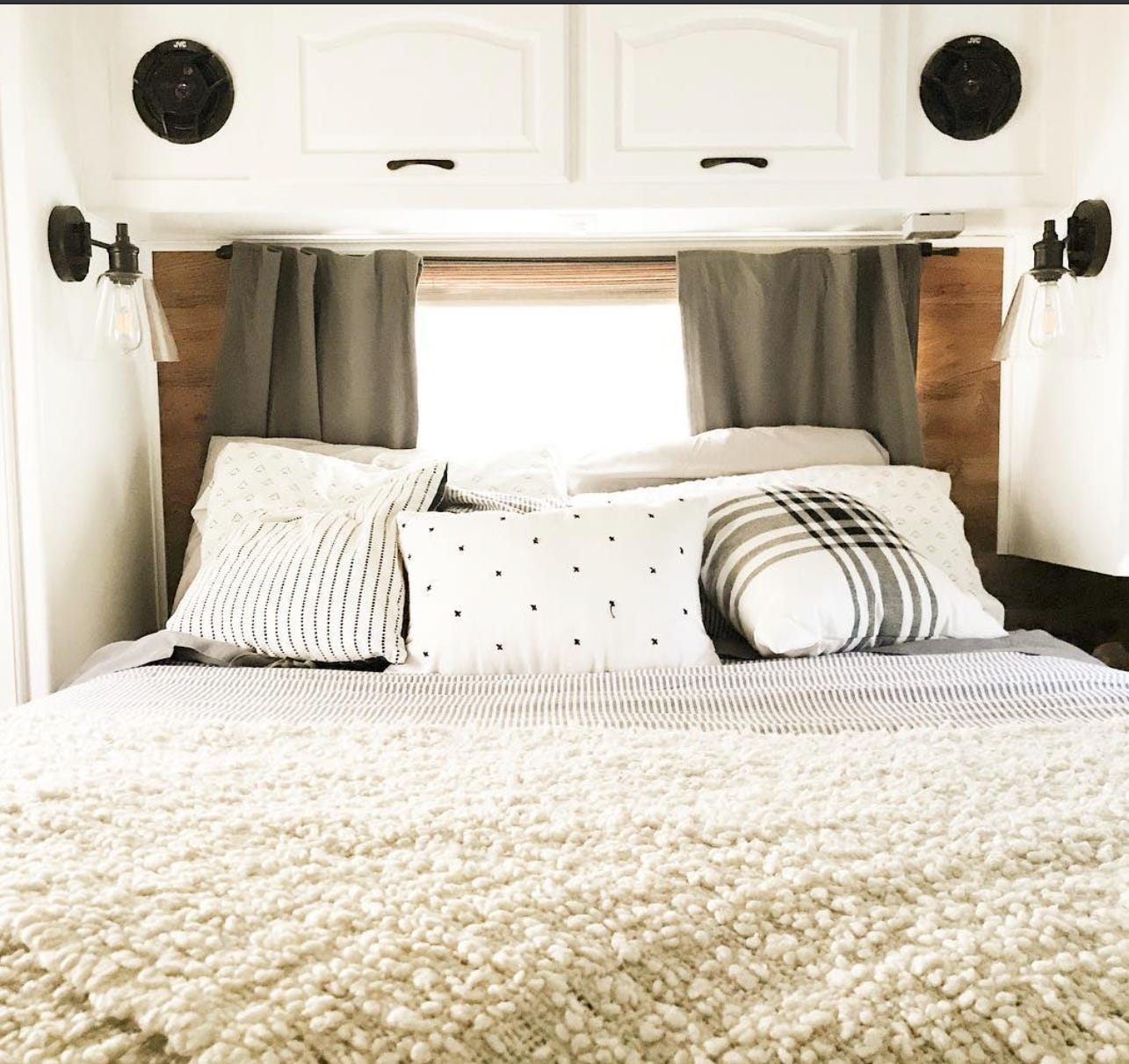 This particular farmhouse bedroom setting lit my Fall fire with the calm ivory and olive green colors. Here is how you can get a similar look to enhance your Fall camping experiences: